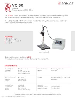 SONICS 超聲波破碎儀 VC 50:是一款小型緊湊的50瓦超聲波處理器??梢杂檬治兆√筋^,轉動前面板上的振幅旋鈕即可激活超聲波能量。包括1/8“探頭(0.5–15mL體積),并提供各種配件,用于各種應用和樣品體積。